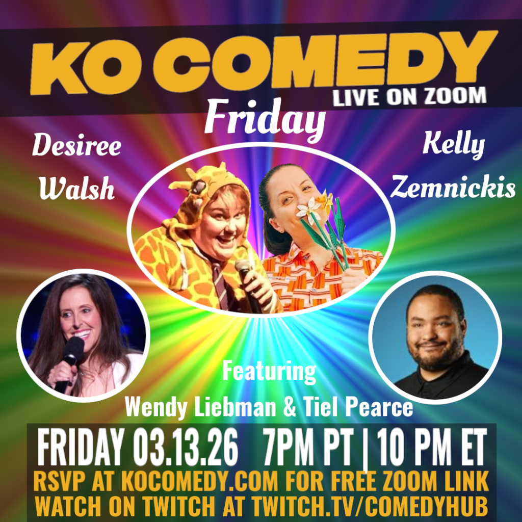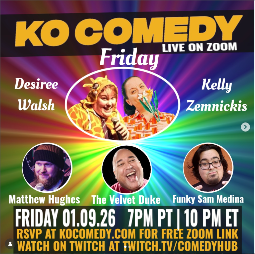 EveryFriday! Join Kelly & Desiree for some awesome comedy. Then hang out with Bianca for some trivia on The Afterparty! Get your free Zoom link at KOcomedy.com or watch on Twitch with @comedyhublive
